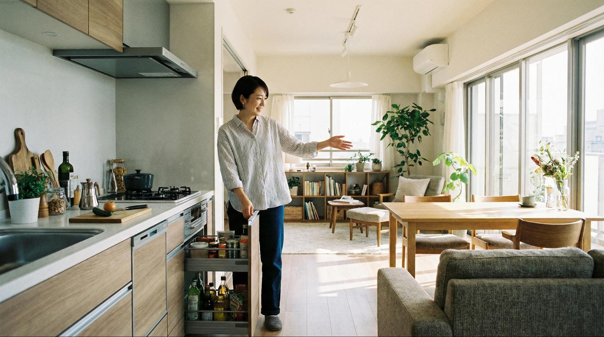 - 可変性: リビング横の部屋が引き戸で仕切れるタイプなら、開け放して広いリビングにしたり、閉じてワークスペースや来客用の寝室にしたりとフレキシブルに使えます。