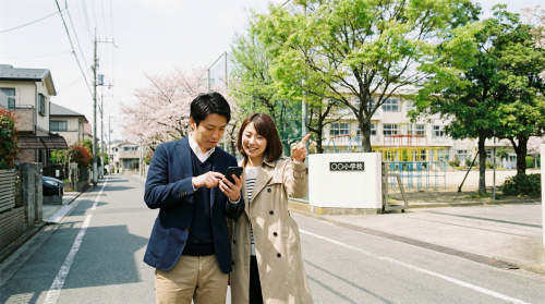 学区探しで最も注意したいのが、学区の「境界線」です。道路一本挟んだ向かい側は別の学区だった、というケースは珍しくありません。不動産広告に「〇〇小・〇〇中学区」と記載されていても、念のため確認が必要です。
